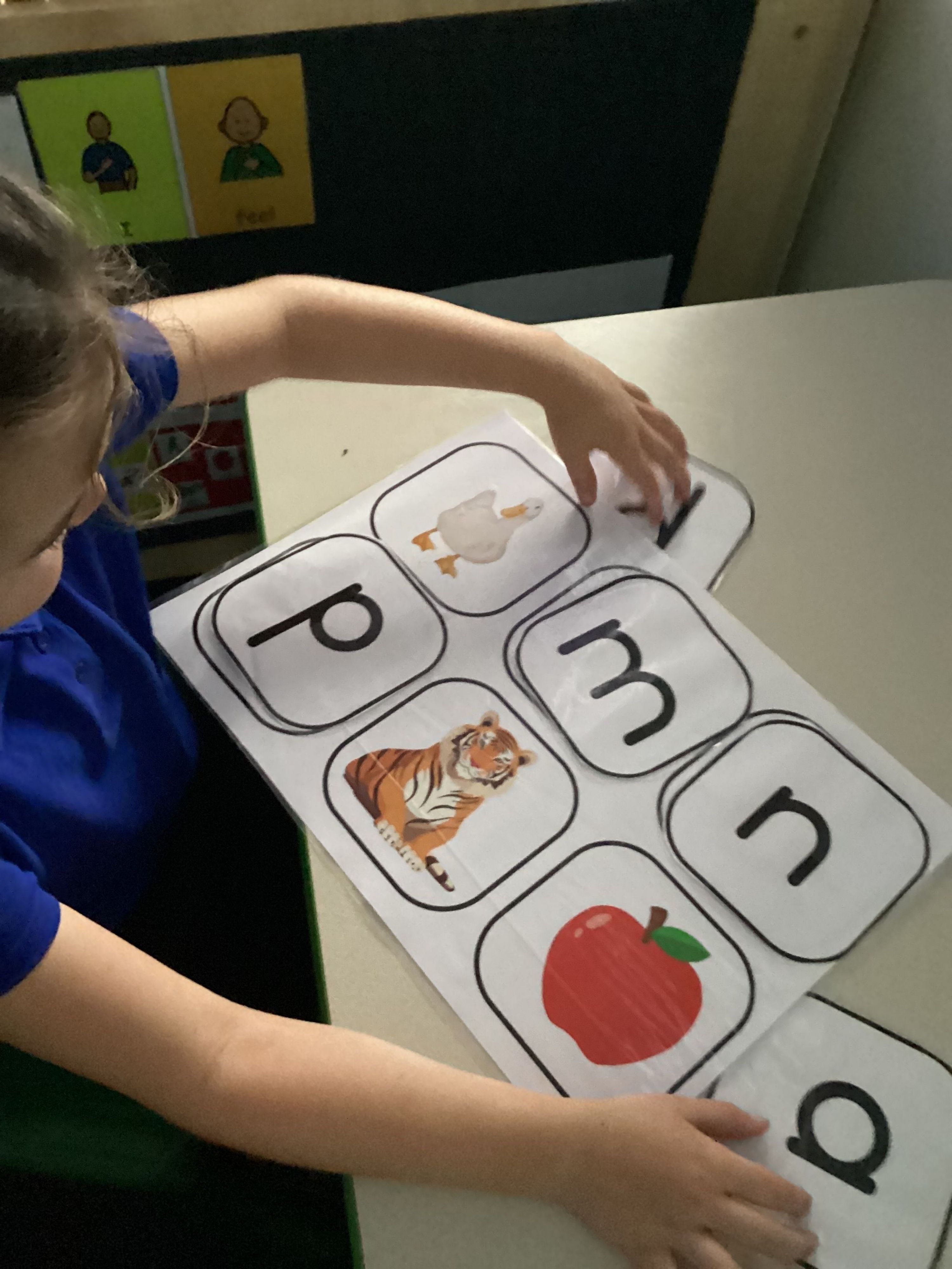 In phonics, we have been working on letter sound recognition, matching the letters and their sounds to the pictures.