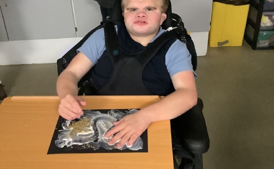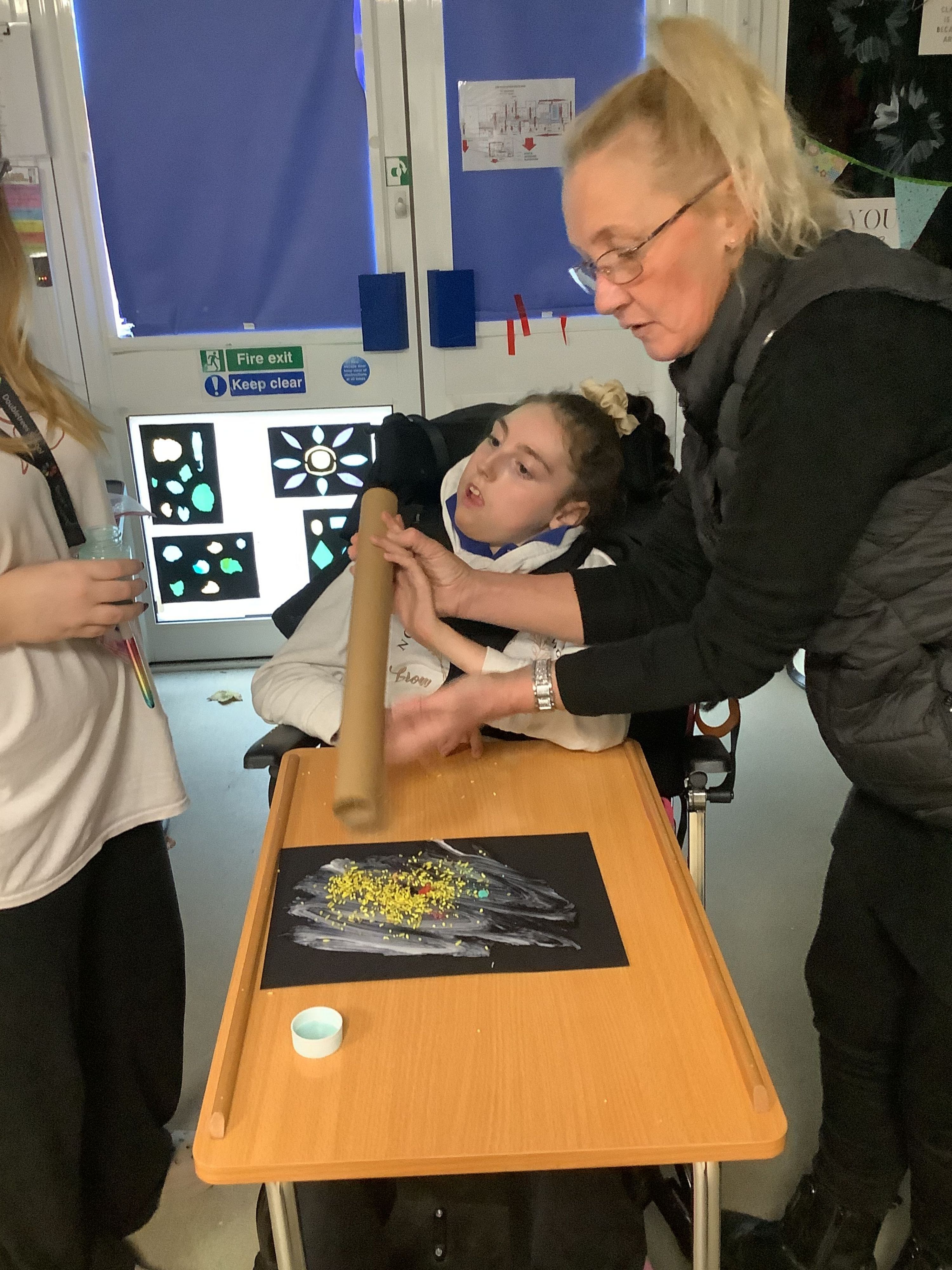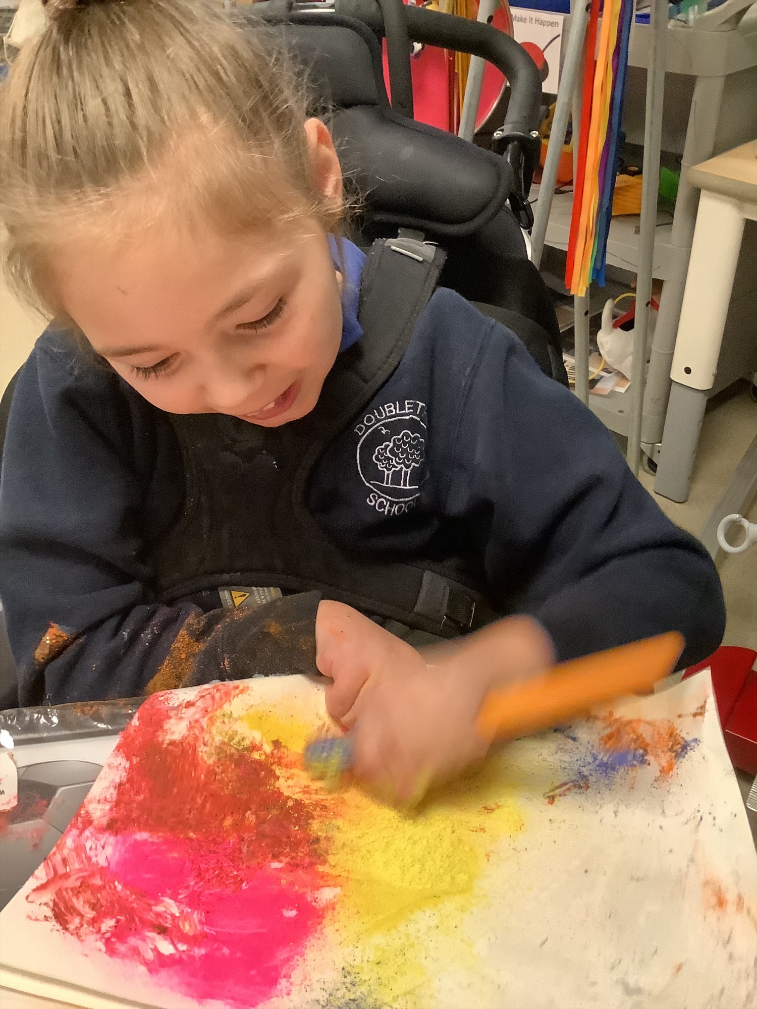 Redwood class explored coloured rice and powdered paint for the Hindu festival of lights- Diwali. We watched and listened to rice trickling down a tube onto black paper and we used our eye pointing skills to communicate which colours we prefer.