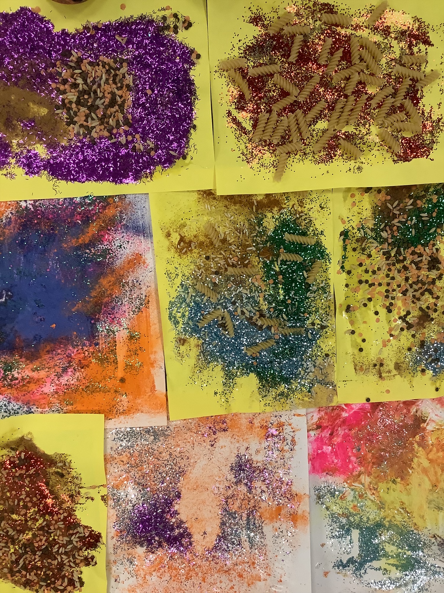 In Apple Class we celebrated Diwali. We explored candles and lights, different spices and listened to Diwali celebratory music. We explored coloured paints, glitter, rice, lentils, shiny items to create textured Rangoli patterns.