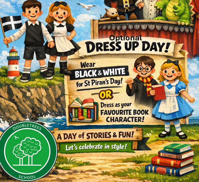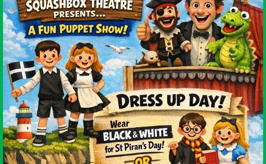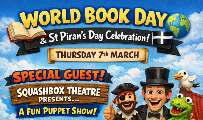 Join us on the 7th March 2026 for World Book Day and St Piran's Day!  Optional dress-up day - Dress in Black and White for St Piran's OR Dress as your favourite Book character!  It's going to be a day full of fun, as we also have the Squashbox Theatre with a special puppet show on site!