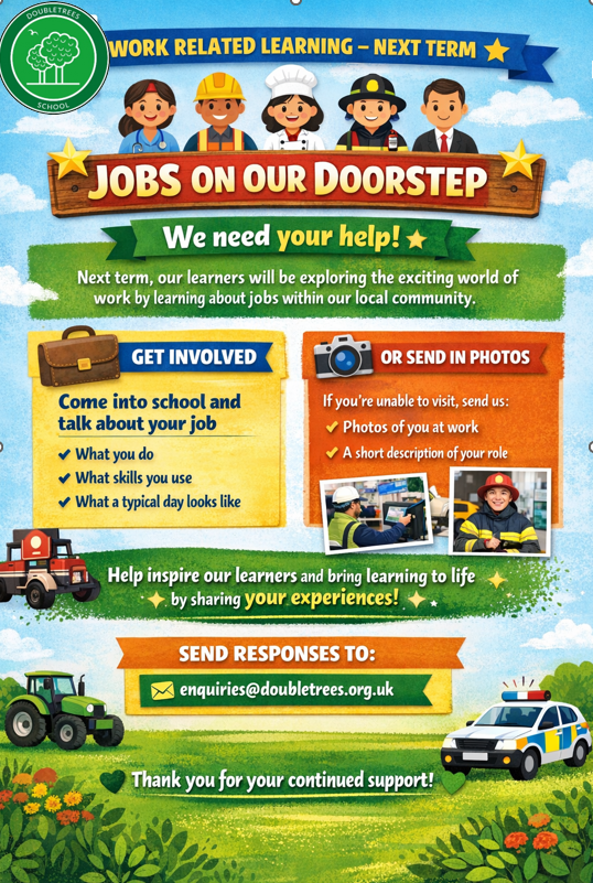 Do any of our parents have a work-related role that you wouldn't mind sharing with our learners? Would you like to come into school to talk about your role and share your experiences? We would love to hear from you! Our learners will really benefit from learning about real-time roles, and how employment and employees, work!