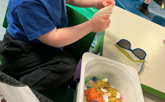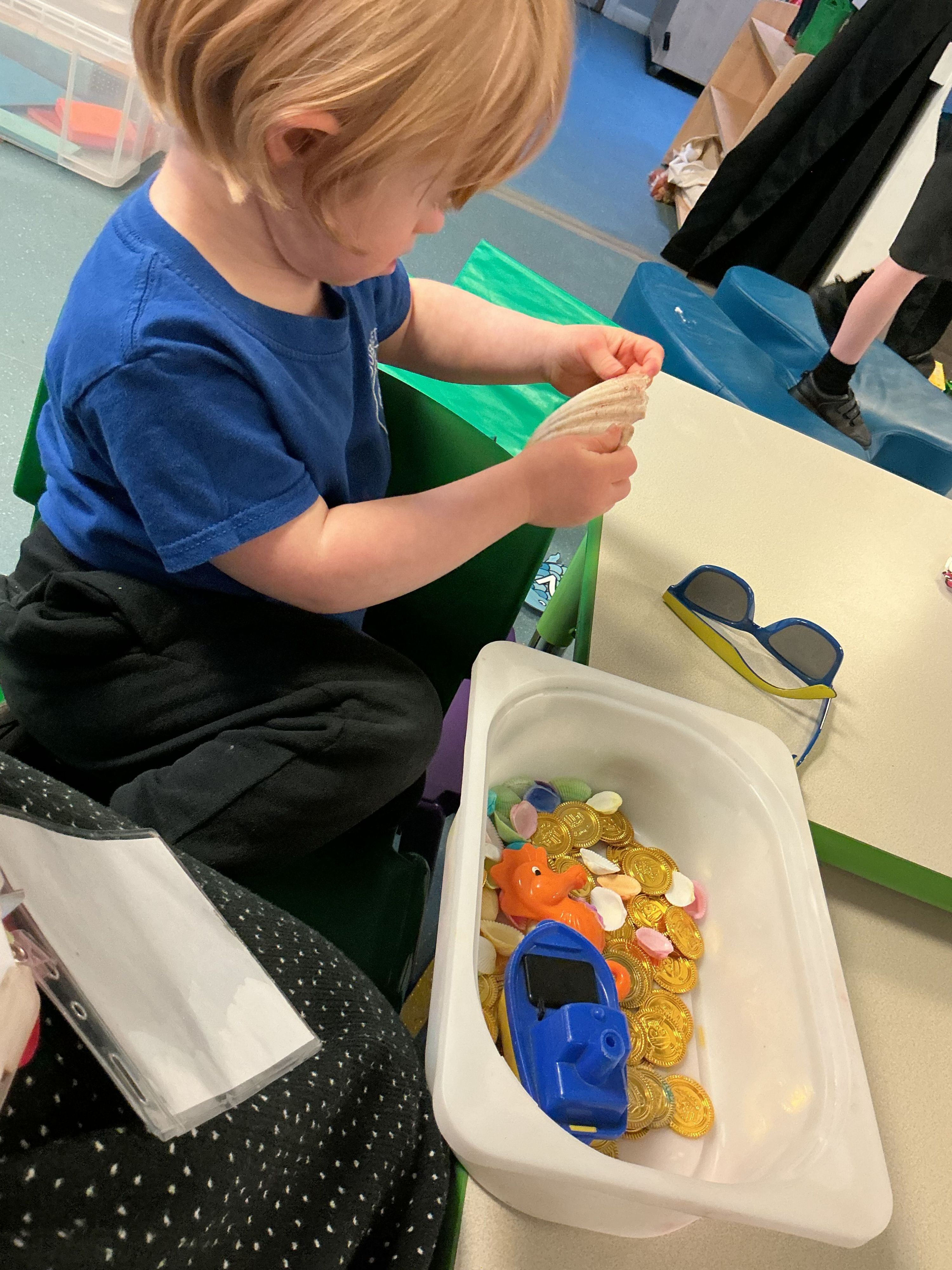 We have been exploring concepts through our topic, Under the Sea. We have been counting treasure and copying arrangements to 5 and 10, as well as using key vocabulary such as 'full' and 'empty' when digging in the sand. This has also promoted our fine motor skills and co-ordination as part of our pre-writing skills. Learners have enjoyed tactile discrimination when sifting through multi-sensory beach themed trays, identifying preferences through persistent exploration.
