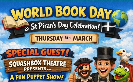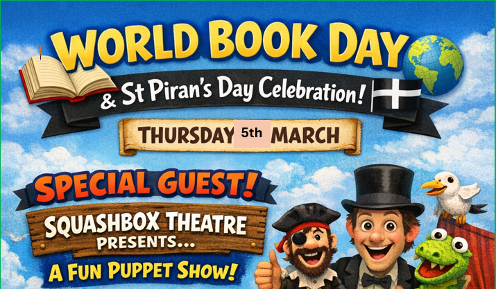 Join us on the 5th March 2026 for World Book Day and St Piran's Day! Optional dress-up day - Dress in Black and White for St Piran's OR Dress as your favourite Book character! It's going to be a day full of fun, as we also have the Squashbox Theatre with a special puppet show on site!